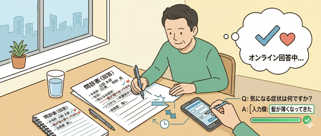 STEP 1:公式サイトで問診に回答 氏名・生年月日・薄毛の状態・既往歴などをフォームに入力します。