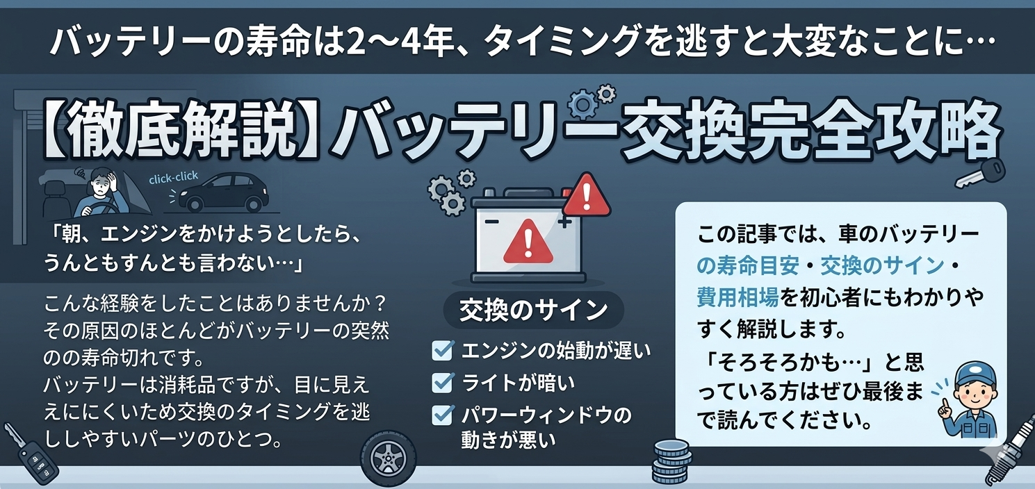 この記事では、車のバッテリーの寿命目安・交換のサイン・費用相場を初心者にもわかりやすく解説します。「そろそろかも…」と思っている方はぜひ最後まで読んでください。