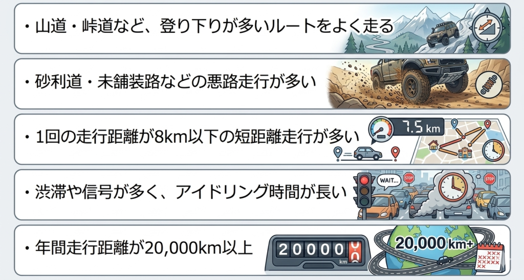 シビアコンディションとは、エンジンに通常より大きな負荷がかかる走行環境のことです。以下に当てはまる方は、交換サイクルを短めに設定しましょう。