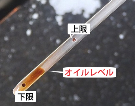 ゲージを拭いて差し直したあと、「MIN」と「MAX」の中間より上にオイルがついていればOKです。MINに近い、またはそれ以下の場合はオイル補充または交換が必要です。
